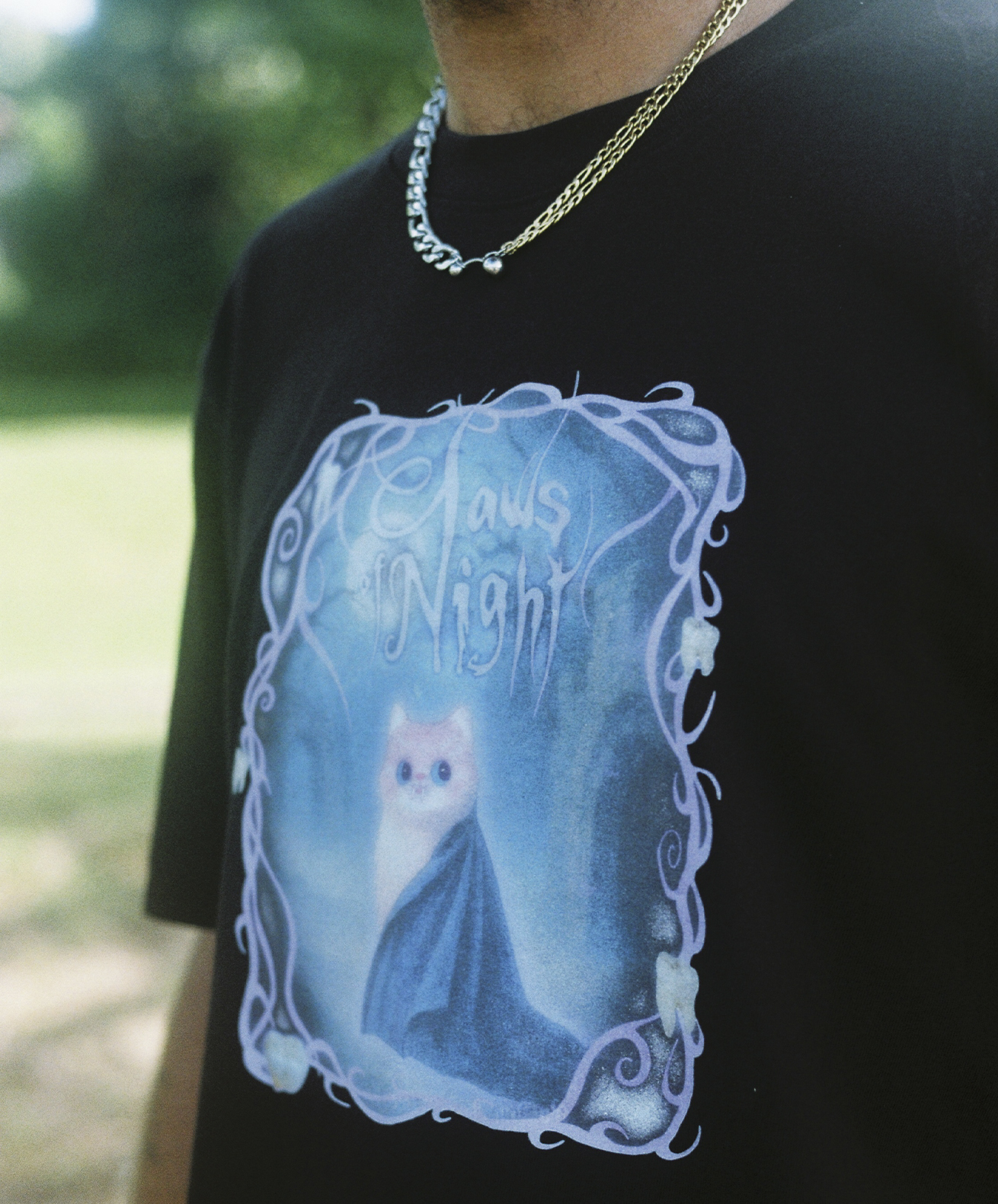Hommage aux films d’horreur technicolor des années 50-70 et à Buffy contre les vampires, elle présente ici son tee-shirt “Claws of Night”, en mettant en scène un chat vampire espiègle devant une ruine de château en carton-pâte qui tient grâce à trois morceaux de scotch : c’est dans ces petits artifices que le charme opère.